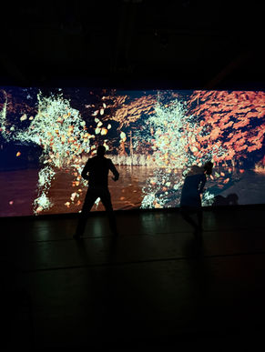 "Gathering is an ethic at the heart of Laia Cabrera and Isabelle Duverger’s looped video installation, Perennial Land: The Data Forest (2024), which invites its audiences into a restful, contemplative, and immersive space, surrounded on three sides by lush images of Earth’s forest environments. These images are interspersed with climate data and scenes of human-planetary relations gone awry, the visual grammar of the Anthropocene. Cabrera and Duverger specialize in public, interactive video works that break down the “uni-directionality” of artistic communication, so that audience members are positioned more as creative collaborators than an inert “audience.” Even as Perennial Land serves harsh reminders of anthropogenic destruction, it also summons hope for other ways of being. Over-stating human destruction can reinforce an ideological binary of nature/culture and obscure long histories of reciprocal care on this planet; Perennial Land, on the contrary, both hails and builds a community invested in responsible co-existence." — Introduction: Care and Climate Justice by Sarah Hamill and Izzy Lockhart, Care and Climate Justice Catalogue, 2024